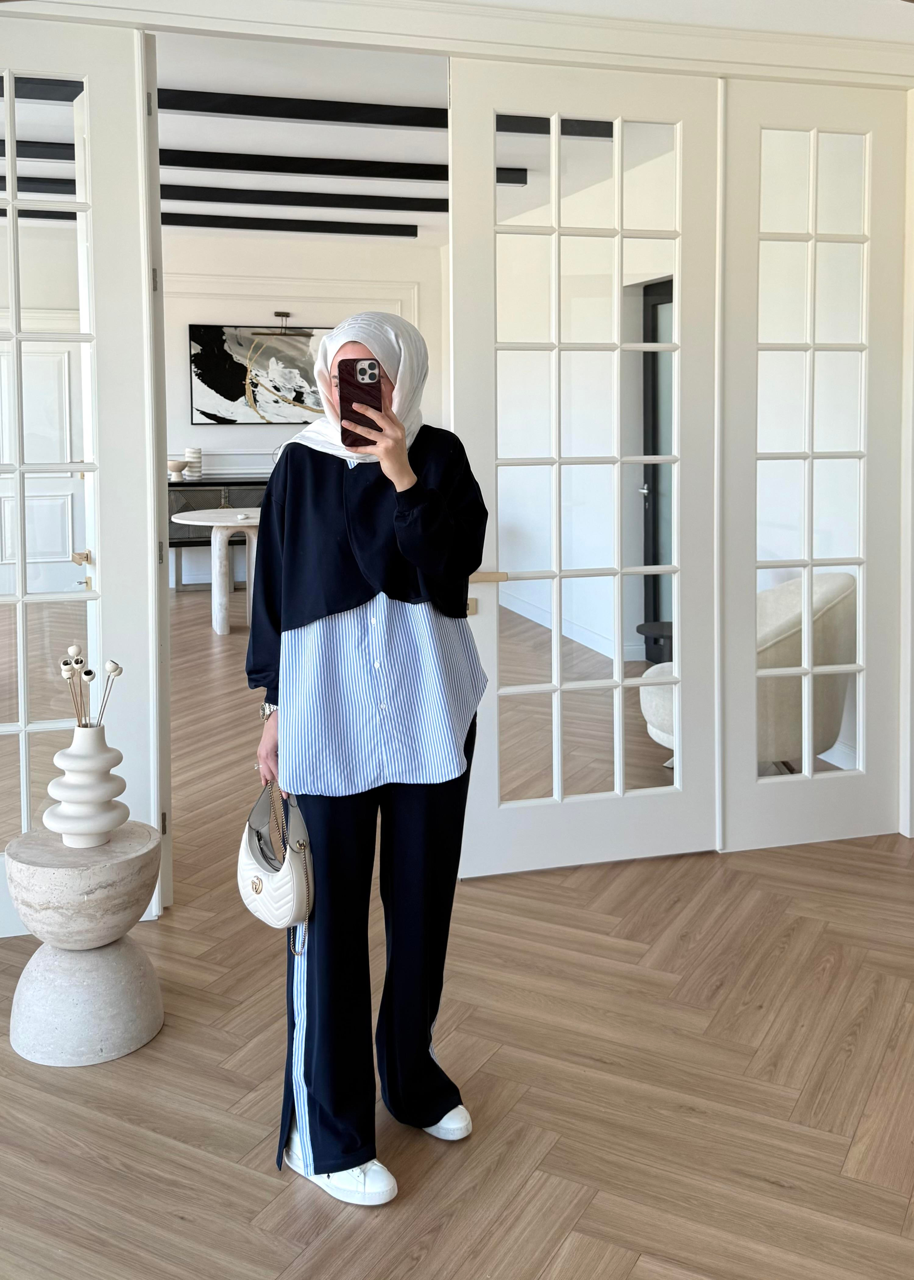 Gömlek poplin kumaştır. Pelerin ve pantolon oysh kumaştır. pantolonun yanı poplin garnilidir , pantolon paça kısmı yırtmaç detaylıdır, gömlek sıfır kolludur , pantolon cep detayı bulunur, gömlek önü tamamen düğmelidir.