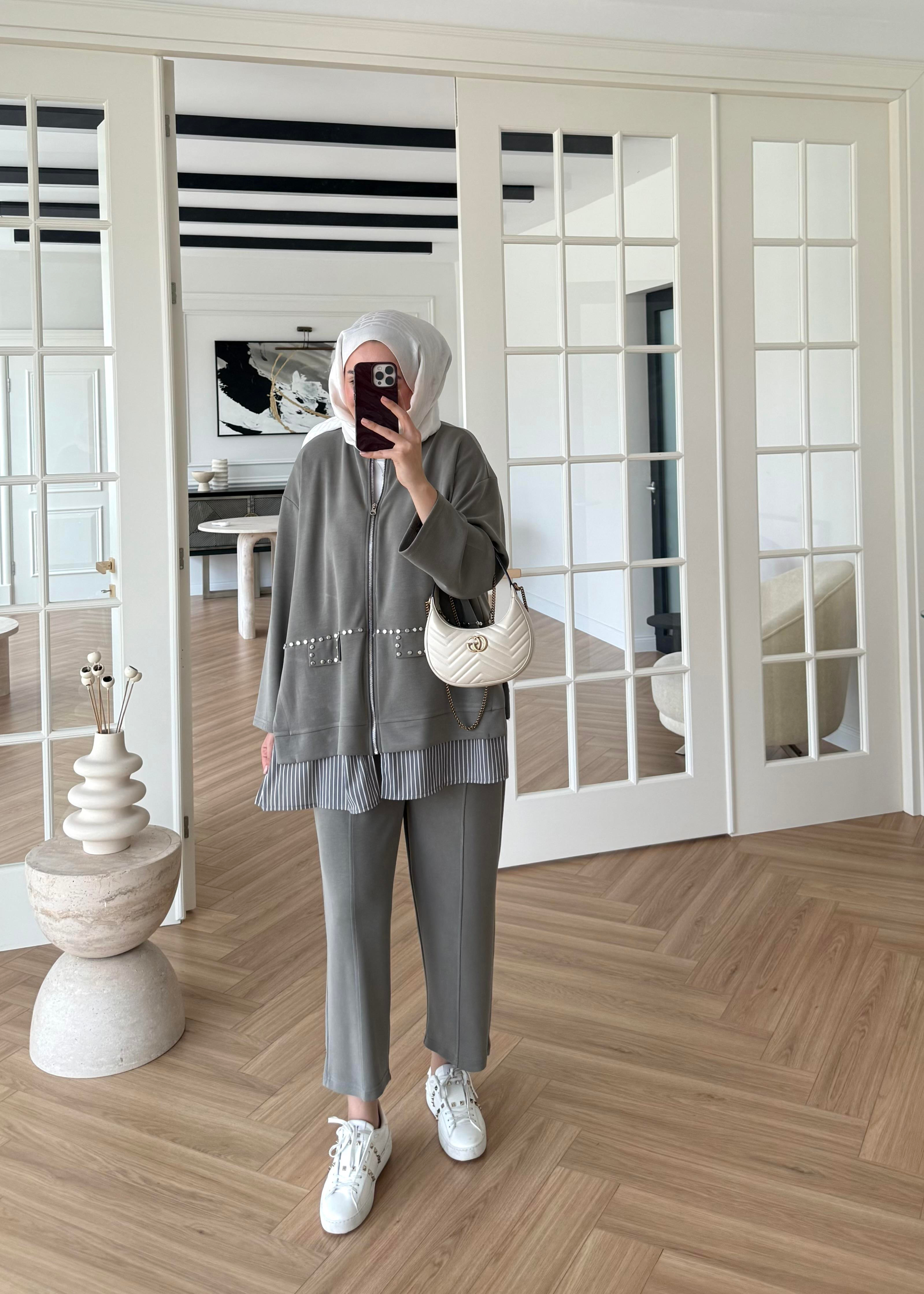 Ürün Özellikleri: Oysh kumaştır. önü komple fermuarlıdır, cep kapak detayı bulunur , minik düğmeler bulunur, etek kısmında çizgiler bulunur,pantolon belilastiklidir.