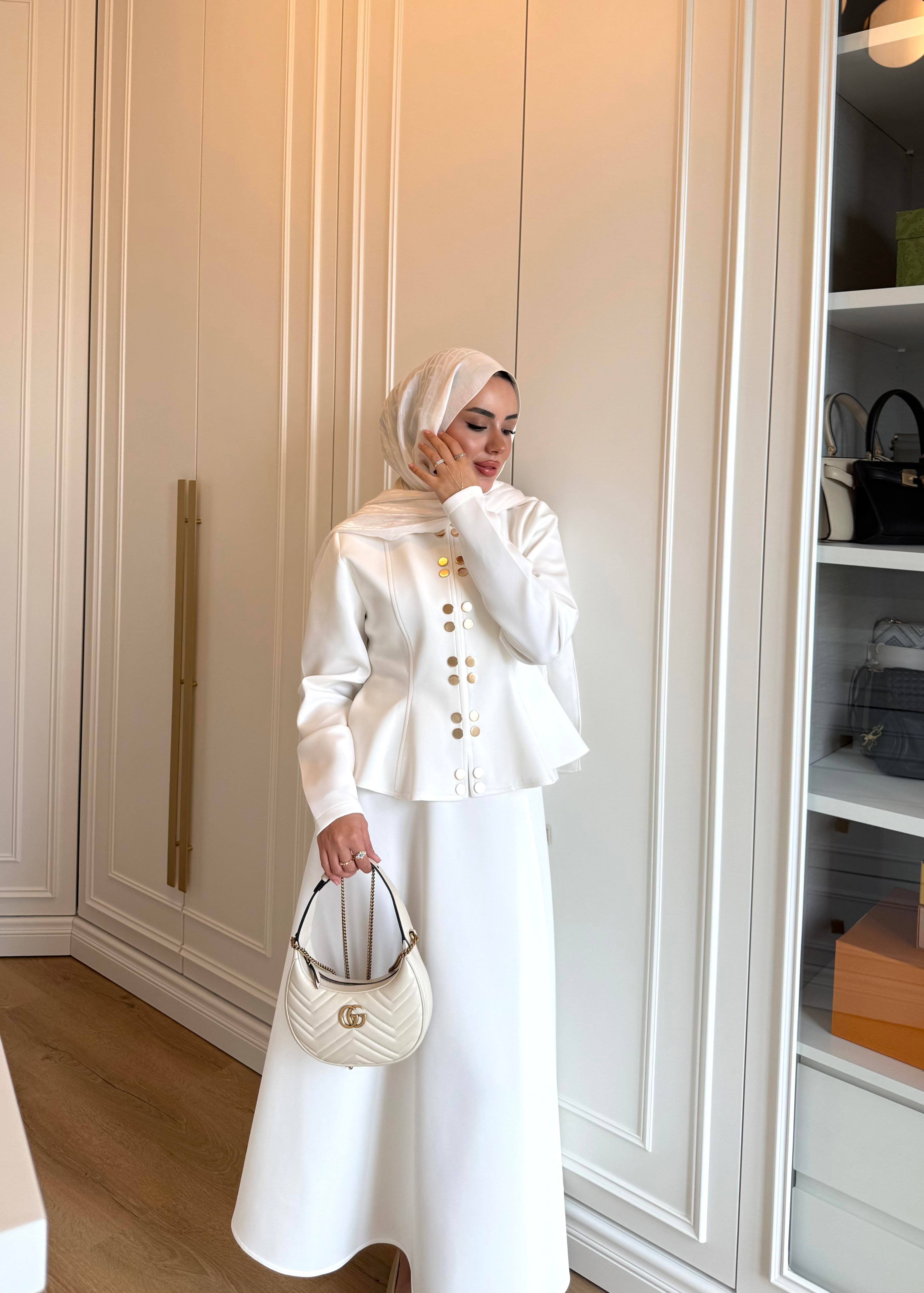Ürün Özellikleri: Ürün belden oturtmalıdır. scuba kumaştır. üstün önü düğmelidir. etek beli fermuarlıdır.