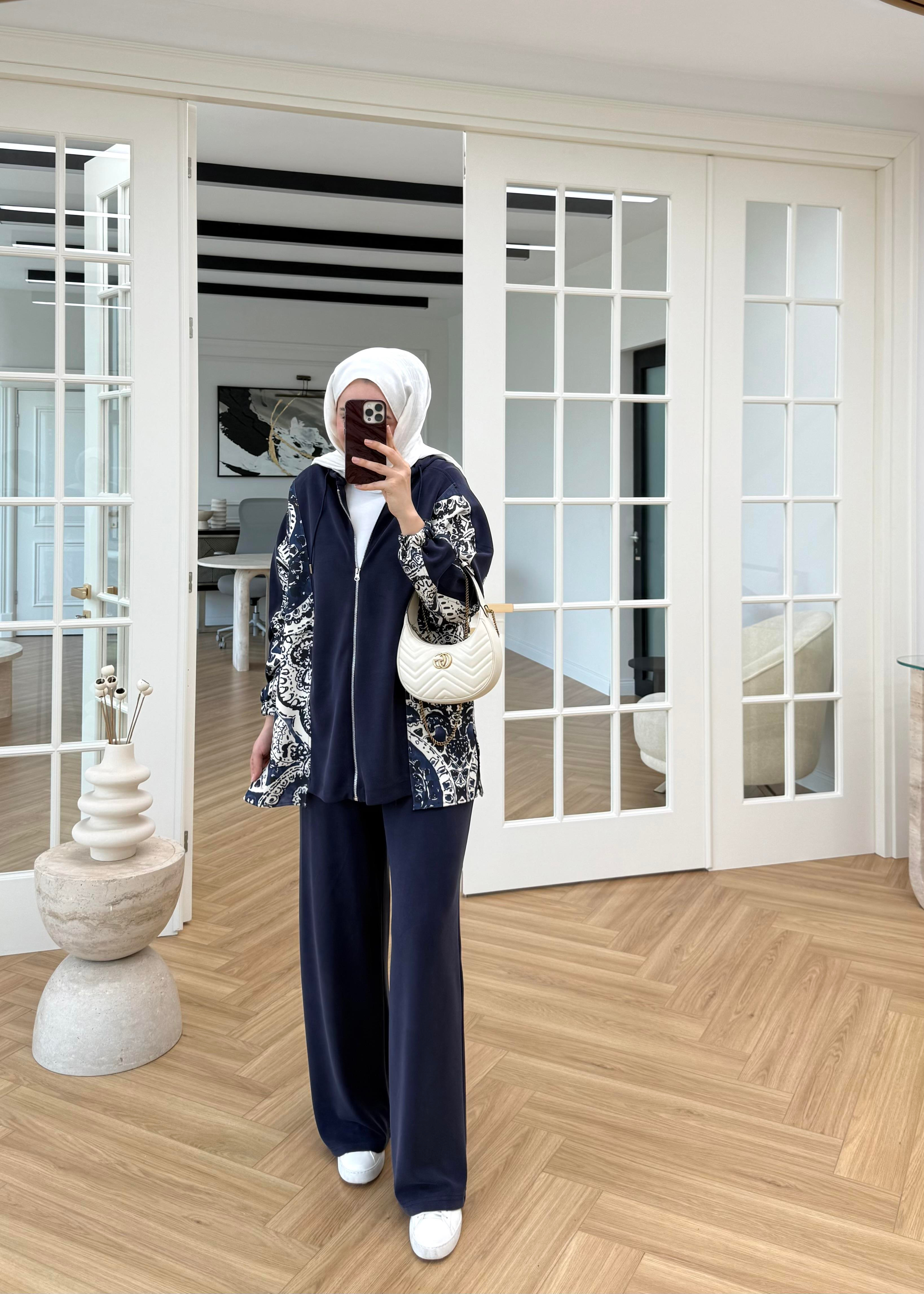 Ürün Özellikleri: Oysh kumaşa sahiptir. yanlarda desenleri mevcuttur, önü komple fermuarlıdır, kapüşonludur. pantolon bel kısmı lastiklidir.