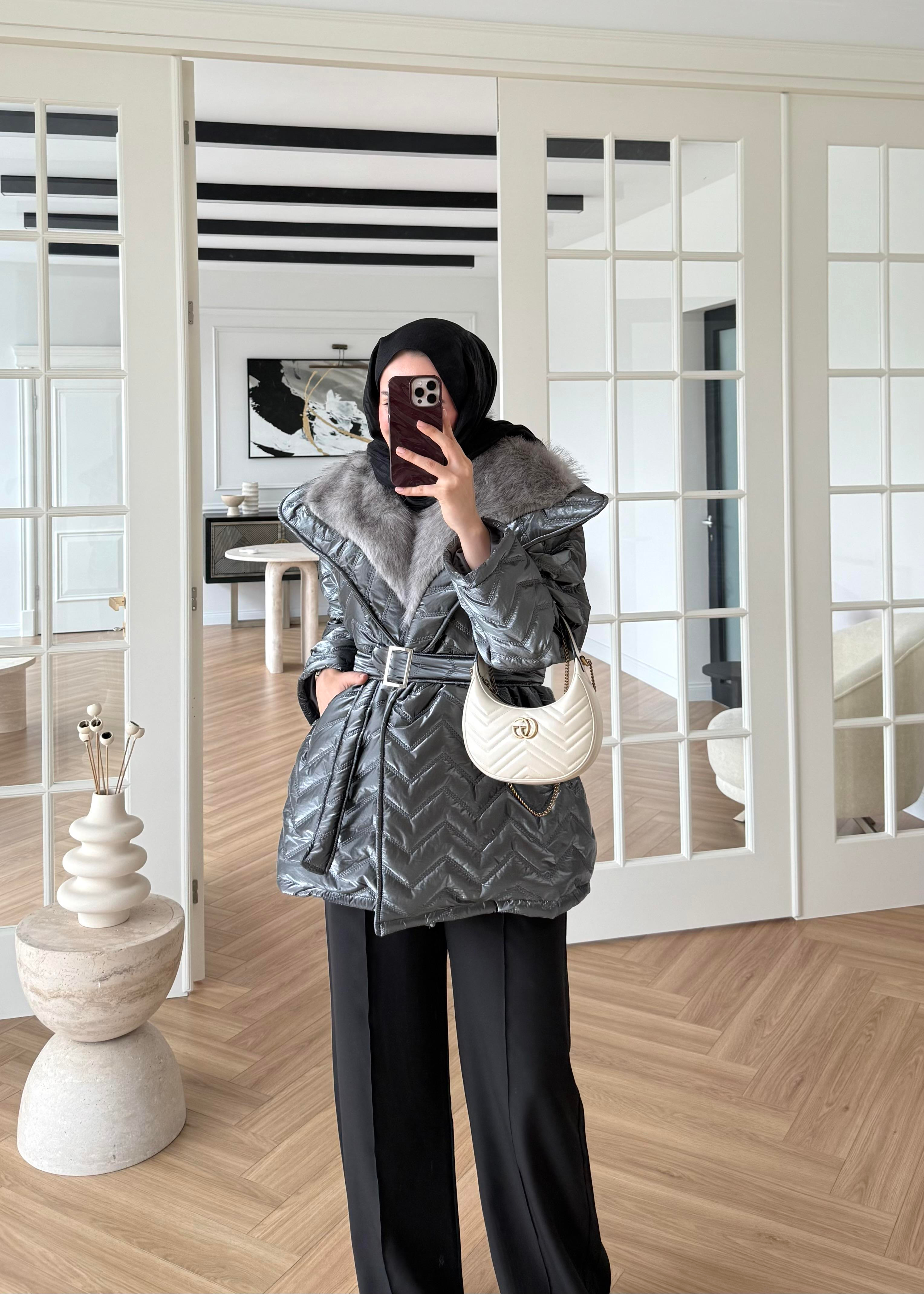 Ürün Özellikleri: Kürklü rugan kumaştır, yakasında kürk detayı vardır ,kemeri mevcuttur, içi komple astalıdır, iki yanında cep detayı bulunur